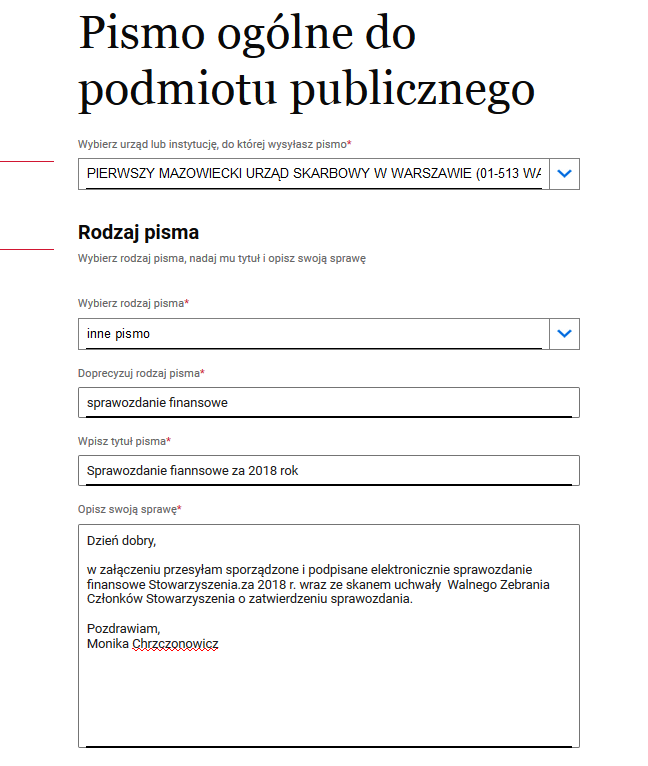 - Po zalogowaniu pojawi się strona z informacjami dotyczącymi pisma ogólnego. Wybierz z listy podmiotów swój urząd skarbowy, określ rodzaj pisma - „inne pismo”, dopisz rodzaj pisma - „sprawozdanie finansowe”, podaj tytuł pisma – to tytuł twojego sprawozdania np. „sprawozdanie finansowe za 2018 rok”, opisz krótko, co wysyłasz i dlaczego (możesz posłużyć się poniższym przykładem). Warto też podać dane organizacji: jej nazwę i numer NIP.