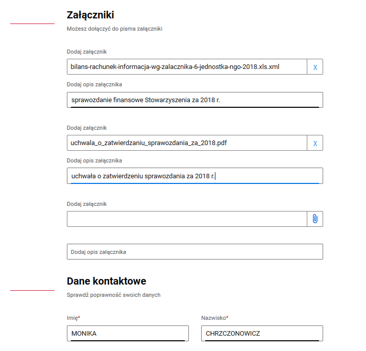 - Dołącz załączniki. Zanim to zrobisz sprawdź czy masz u siebie (na dysku komputera, w mailu, na pendrajwie) sprawozdanie finansowe sporządzone elektronicznie i elektronicznie podpisane przez księgową i przez wszystkich członków zarządu. Pamiętaj, że tylko takie sprawozdanie spełnia wymogi ustawy o rachunkowości. Jak sprawdzić czy są wszystkie podpisy? Wchodząc na stronę obywatel.gov.pl, wybierając możliwość elektronicznego podpisania dokumentu i korzystając z opcji sprawdzenia dokumentu. Kolejny - po samym sprawozdaniu - załącznik to skan/zdjęcie uchwały o zatwierdzeniu sprawozdania finansowego. Z przepisów nie wynika bezpośredni wymóg jej załączenia, jednak rekomendujemy takie rozwiązanie. Dodanie tego załącznika nie jest dla organizacji dużym wyzwaniem (uchwałę zatwierdzającą i tak NGO musi mieć), a kiedy znajdzie się ona w urzędzie, ten będzie miał jasność, że sprawozdanie zostało zatwierdzone w terminie i w terminie wysłane. Jeśli nie załączymy uchwały urząd może zechcieć dochodzić tego sam. Przepisy zmieniły się w tym roku, nie do końca wiadomo jaka będzie praktyka i dlatego polecamy, żeby uchwałę wysłać, bo powinna ona rozwiać wszelkie wątpliwości. Uwaga! Jeśli jakaś osoba z zarządu odmówiła podpisania sprawozdania finansowego to dołącza się również skany/zdjęcia takiej odmowy.