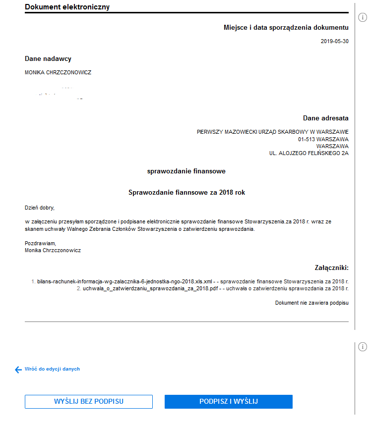- Po wypełnieniu i „kliknięciu” dalej pojawi się dokument elektroniczny (jak niżej) z wprowadzonymi informacjami. Przeczytaj, sprawdź czy nie zaszła pomyłka. Teraz już czeka cię tylko wysłanie. Możesz to zrobić klikając „wyślij bez podpisu” albo (tak rekomendujemy) klikając „podpisz i wyślij”.