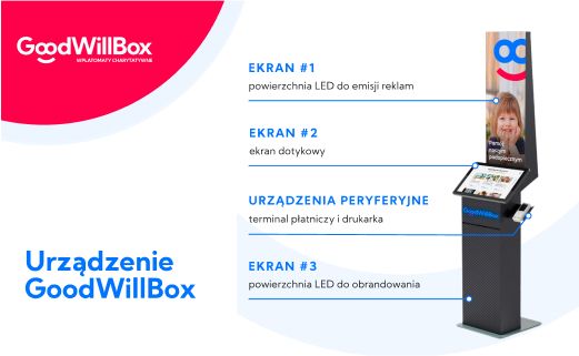 Wpłatomat GoodWillBox ma dwa ekrany. Jeden z nich może wyświetlać organizowane przez fundację zbiórki, a drugi stanowić przestrzeń reklamową. Dodatkowo urządzenie można obrandować logotypem sponsora.