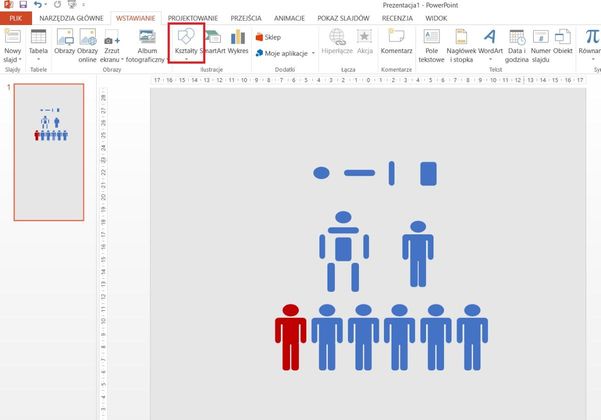 Choć funkcje edycyjne PowerPointa wydają się dość ubogie w porównaniu z możliwościami profesjonalnych edytorów grafiki, można z ich pomocą szybko znaleźć lub wykonać często stosowane w infografikach obrazy. Np. na poniższym rysunku pokazujemy, jak za pomocą narzędzi „elipsa” i „zaokrąglony prostokąt”, dostępnych w menu „Wstawianie” – „Kształty” – stworzyć popularny symbol postaci ludzkiej. Po złożeniu poszczególnych elementów obrazka łączymy je w całość korzystając z funkcji „Grupuj”.
