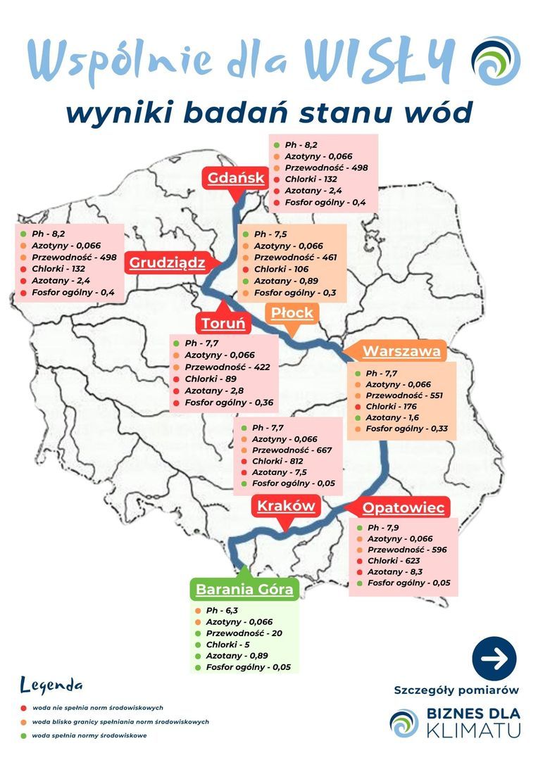 Przyjrzenie się tym parametrom, wskazuje najprawdopodobniej na duży wpływ ścieków przemysłowych, zwłaszcza na odcinku rzeki Kraków-Opatowiec. Pomiary przewodności elektrolitycznej i stężenia chlorków są powiązane z sobą, wzrost obu w takim rejonie Polski powinien zastanawiać i stanowić ostrzeżenie dla aktywnego użytkownika rzeki. Warto zwrócić też uwagę na przekroczenia parametru azotanów, bardzo wysokie w Krakowie i Opatowcu, ale też w Toruniu i Grudziądzu, co świadczyć może w wpływie nawożenia pól w tych lokalizacjach. Warto też zauważyć, że o ile wskaźniki przewodności mieściły się w normie, poza wynikami z Gdańska, to już wyniki badania chlorków były przekroczone względem normy w każdej badanej lokalizacji – ocenia dr inż. Andrzej Staniszewski z firmy BIOPRO, ekspert fundacji Biznes dla Klimatu.