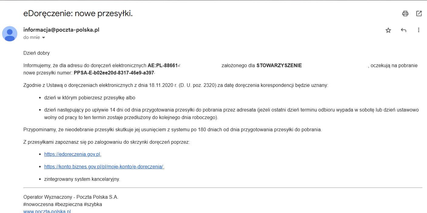 Powiadomienia przychodzą z adresu [email protected] warto dodać ten adres do filtrów antyspamowych naszych serwerów pocztowych, gdyż niestety zdarza się, że serwery uznają wiadomości z Poczty Polskiej za spam. Powiadomienie o którym tu piszemy (pokazane też poniżej) przychodzi na naszą standardową skrzynkę e-mail, z której korzystamy (nie na skrzynkę e-Doręczeń).