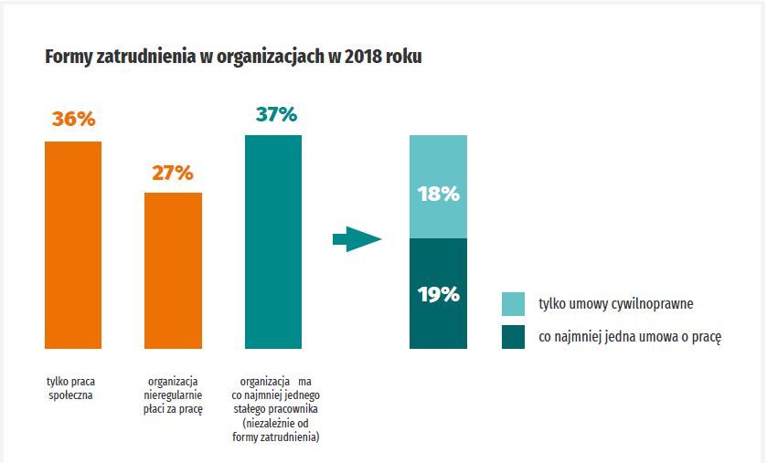 Opisując problemy pracowników organizacji pozarządowych wyszliśmy od podstawowych danych o zatrudnieniu w sektorze. Z badań Stowarzyszenia Klon/Jawor wynika, że 40% organizacji płaci za pracę co najmniej jednej osobie regularnie pracującej na jej rzecz. W połowie z tych organizacji wszystkie osoby otrzymują wynagrodzenie na podstawie umów cywilnoprawnych. Z kolei dane GUS pokazują, że co czwarta osoba, dla której praca w organizacji stanowi główne źródło utrzymania, współpracuje z nią na podstawie umów cywilnoprawnych. W skali całej gospodarki odsetek pracowników, dla których głównym źródłem dochodu są umowy cywilnoprawne, to nie więcej niż 8% ogółu pracujących (dane za 2018 rok).