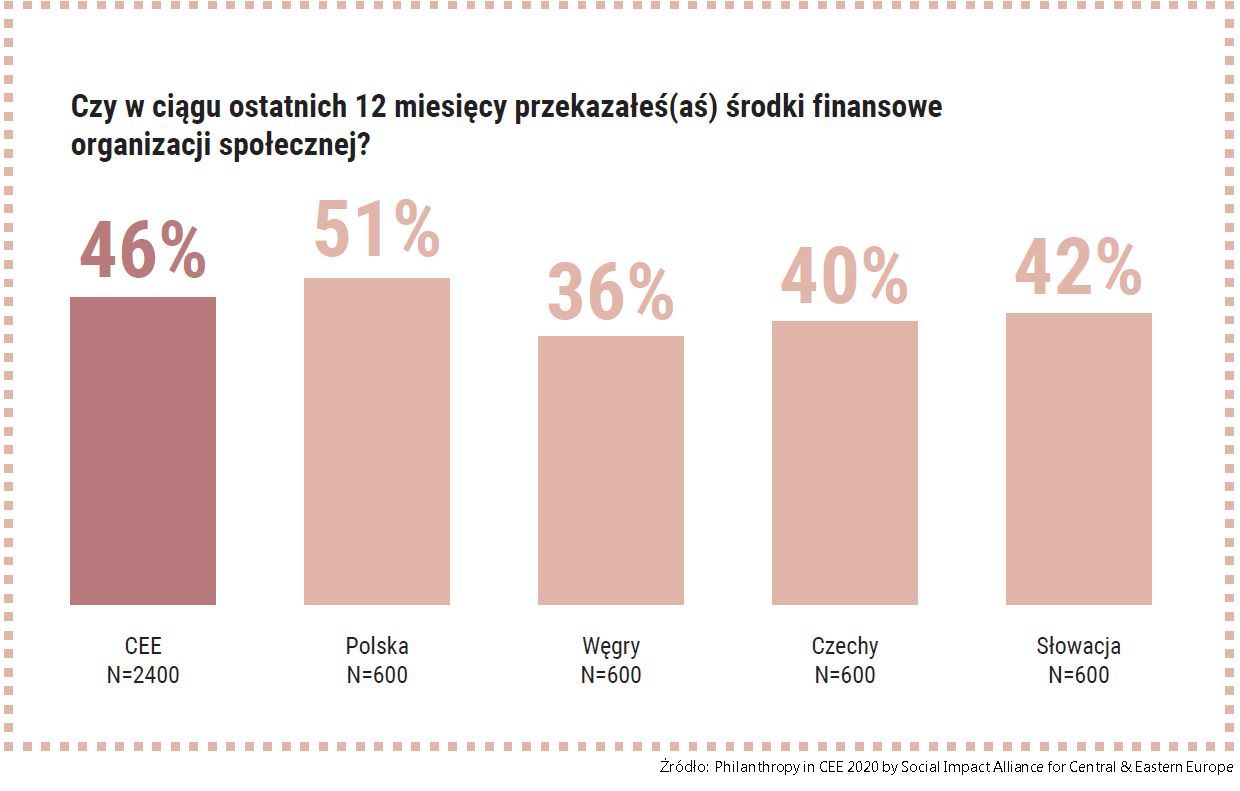 Z badania wynika, że 51% Polaków w ciągu ostatnich 12 miesięcy wsparło finansowo organizację społeczną. Oznacza to, że jesteśmy bardziej skłonni do dobroczynności niż mieszkańcy innych krajów Europy Środkowo-Wschodniej: w Czechach, na Słowacji i na Węgrzech środki na rzecz organizacji przekazuje ok 40% obywateli. Jednak porównanie wyników badań z 2020 roku do tych prowadzonych dekadę temu przynosi mniej optymistyczne wnioski. Ogólny poziom filantropii w Polsce nie zmienił się znacząco przez ostatnie 10 lat. W 2010 roku 54% Polaków deklarowało, że w ciągu ostatnich 12 miesięcy co najmniej raz wsparło organizację przekazując środki finansowe lub rzeczowe.
