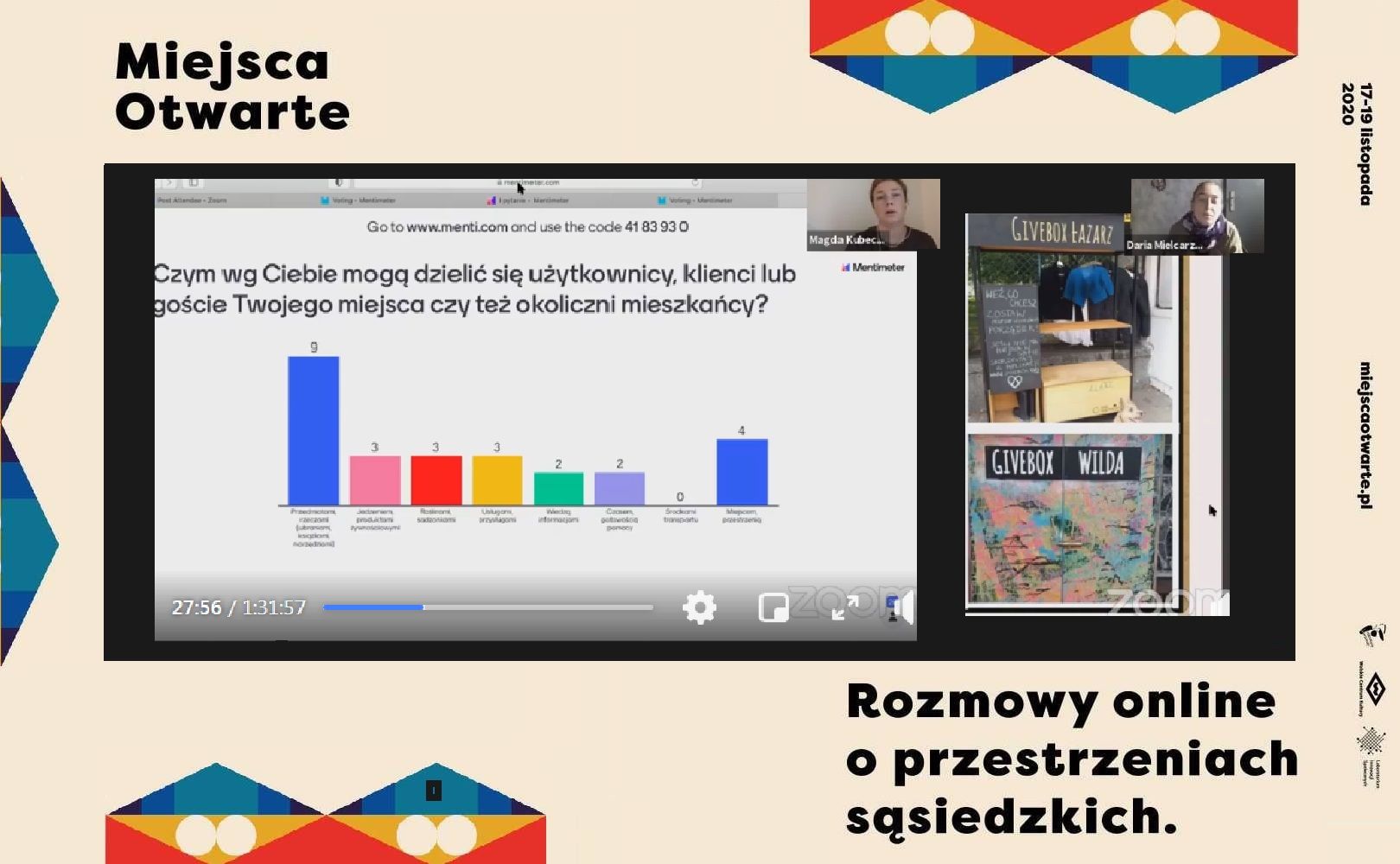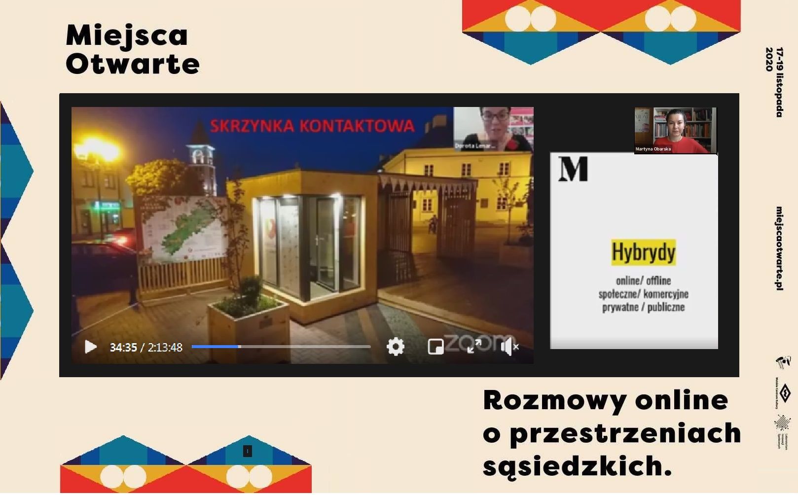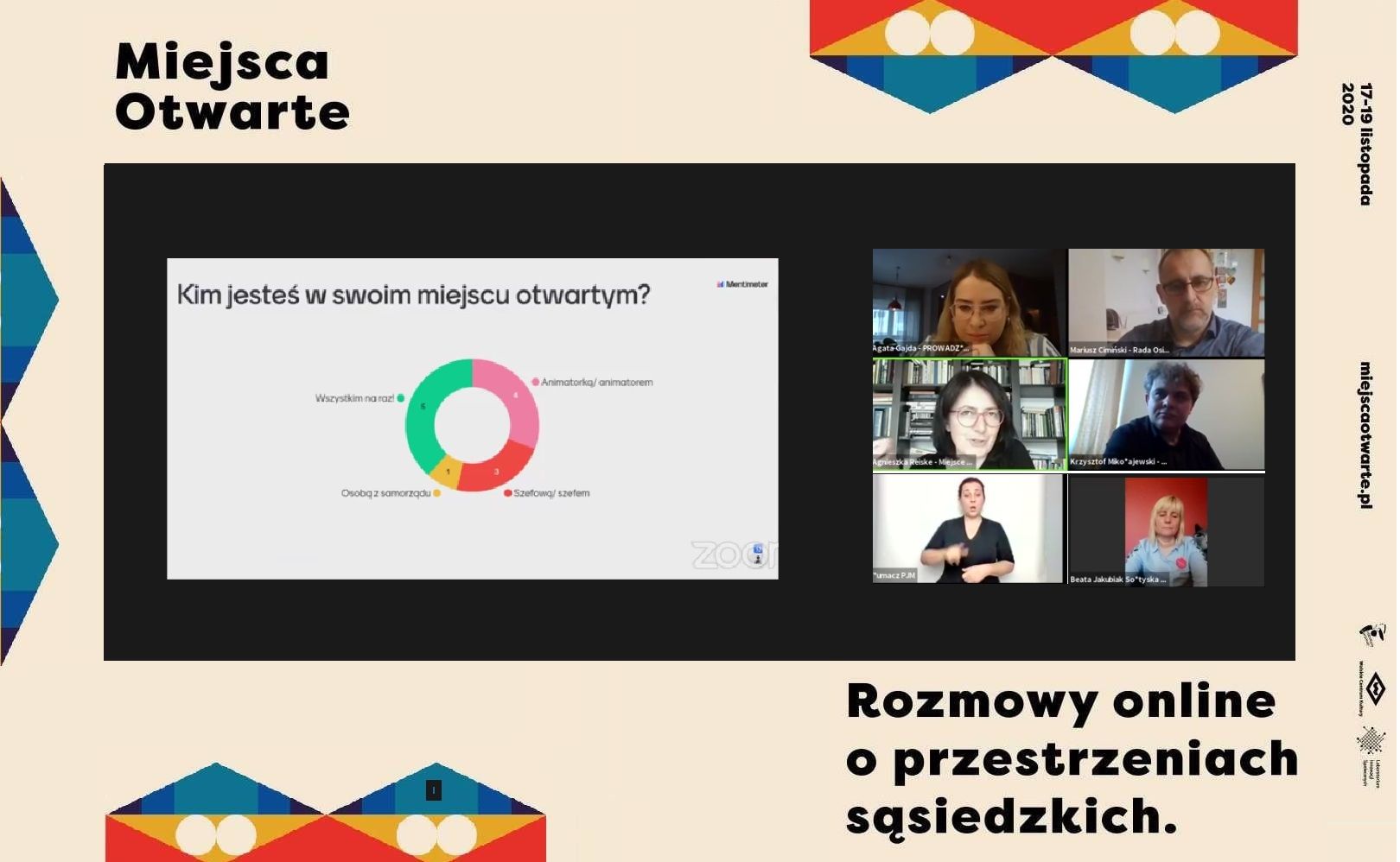 Wydarzenie „Miejsca Otwarte. Rozmowy online o przestrzeniach sąsiedzkich”, które odbyło się w dniach 17-19 listopada 2020 r. było okazją do corocznego spotkania osób prowadzących i wspierających tzw. miejsca otwarte z całej Polski. Pomimo formuły online uczestnikom i uczestniczkom udało się stworzyć przyjazną atmosferę sprzyjającą wymianie doświadczeń i szczerej dyskusji o bieżących wyzwaniach. Organizatorami wydarzenia byli Urząd m.st. Warszawy, Wolskie Centrum Kultury i Laboratorium Innowacji Społecznych z Gdyni.