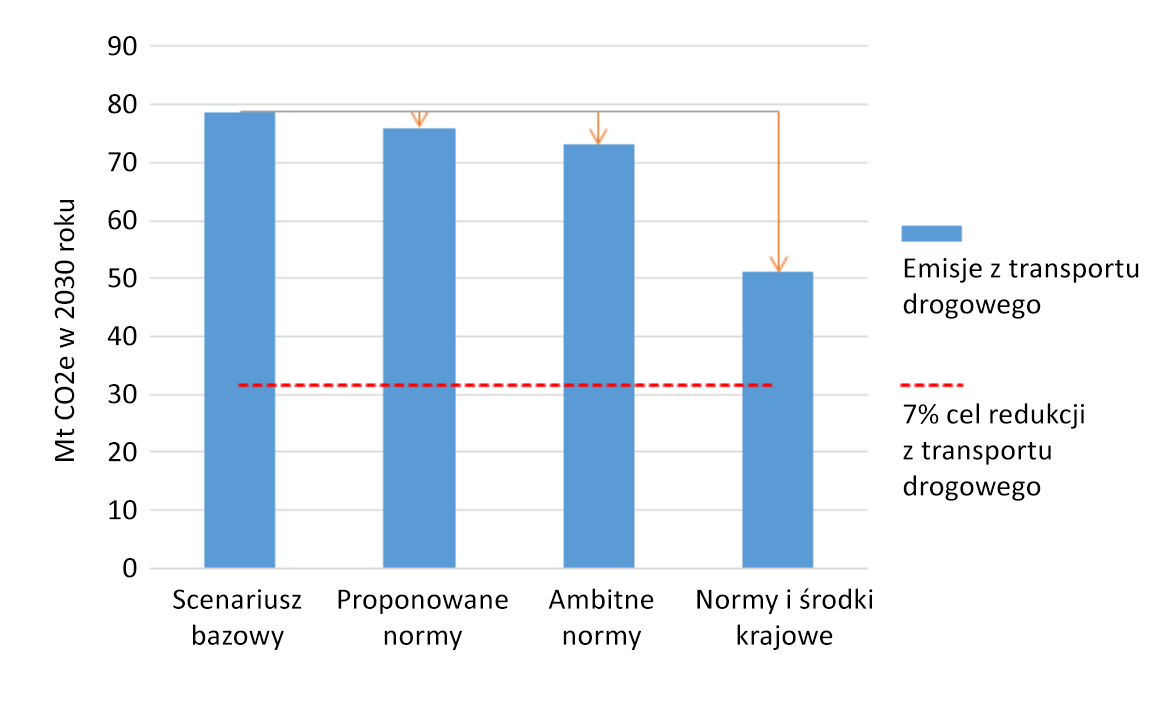 Nawet najbardziej ambitny scenariusz, w którym założono połączenie wielu krajowych działań z wysokimi normami dla pojazdów na poziomie unijnym skutkuje brakiem 19,6 mln ton CO2. Pomimo szczególnie ambitnych założeń, np. osiągnięcia w 2030 roku pułapu sprzedaży nowych samochodów elektrycznych na poziomie 50% i 100% dla autobusów miejskich i znaczącego zwiększenia udziału transportu kolejowego w stosunku do drogowego, pieszego i rowerowego w stosunku do samochodowego.
