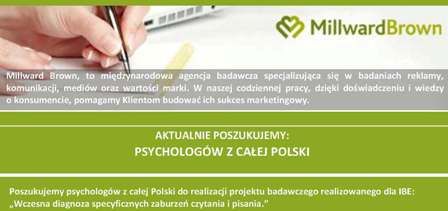 Millward Brown, międzynarodowa agencja badawcza poszukuje psychologów z całej Polski do realizacji projektu badawczego realizowanego dla IBE: „Wczesna diagnoza specyficznych zaburzeń czytania i pisania”.