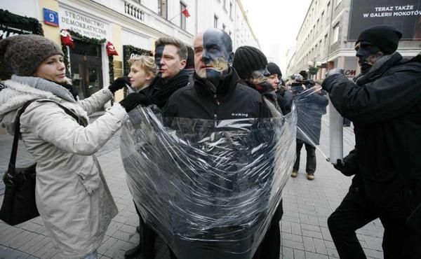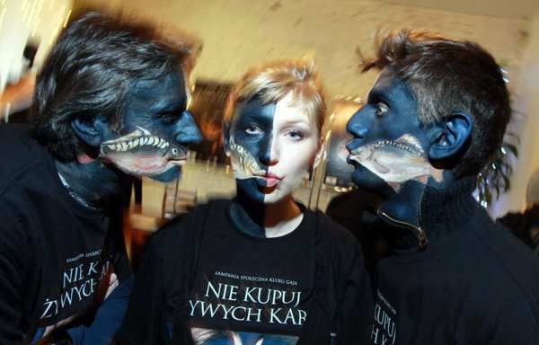 Warszawski happening zorganizowano z udziałem członków Stowarzyszenia Międzynarodowych Inicjatyw Artystycznych EduTeArt i artystów Teatru XL (działającego przy stowarzyszeniu). Już od rana, dzięki studentom Wyższej Szkoły Artystycznej w Warszawie na twarzach artystów pojawiały się drobiazgowo wykonane wizerunki karpi tak, by pyszczki ryb znajdowały się dokładnie na wysokości ludzki ust. W ten sposób powstała 20-osobowa grupa „karpi z ludzką twarzą” (z udziałem członków Klubu Gaja), która, w jednolitych ciemnych ubraniach, z efektownymi obrazami na twarzach, przyciągała spojrzenia przechodniów, operatorów i fotoreporterów. Owinięci folią, ciasno bez swobody ludzie – karpie naśladowali ryby stłoczone w sztucznym basenie.