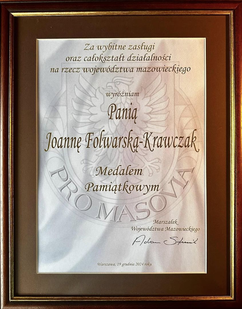 Przyznany Pani Joannie Folwarskiej -Krawczak order "Pro Masovia" to wyraz najwyższego uznania za zasługi na rzecz rozwoju województwa mazowieckiego. Szczególna wrażliwość i empatia Pani Joanny dostrzegalne są w każdym obszarze jej zaangażowania. Dowodem na to jest również wcześniejsze uhonorowanie jej działalności Dyplomem Uznania Marszałka Województwa Mazowieckiego za wybitne zasługi na rzecz osób wykluczanych.