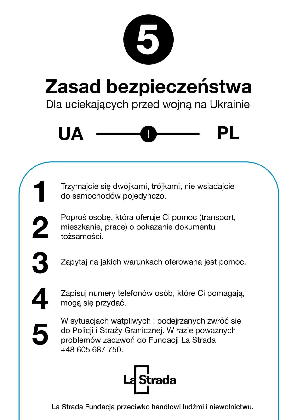 – Zdecydowanie. Trzymanie kogoś pod kloszem nigdy nie jest dobrym rozwiązaniem. A zetknęłam się z sytuacją, że jeden ośrodek, który przyjął osoby z Ukrainy zabraniał kobietom wychodzić dalej niż poza najbliższą okolicę i jeździć autobusem. To jest bez sensu, tym bardziej, że one wcale takiego traktowania nie oczekują. Same mogą podejmować decyzję, także jeśli chcą podjąć świadczenie usług seksualnych, bo czasy są trudne i mogą uznać, że w ten sposób szybko zarobią pieniądze dla siebie i dzieci. Trzeba po prostu zachować spokój. Na granicy jest bezpiecznie, odpowiednie służby starają się, by tak było. My stworzyłyśmy pięć zasad bezpieczeństwa – są one proste, pokazują na co warto uważać. Nie należy straszyć i szerzyć paniki, bo to nikomu nie służy.