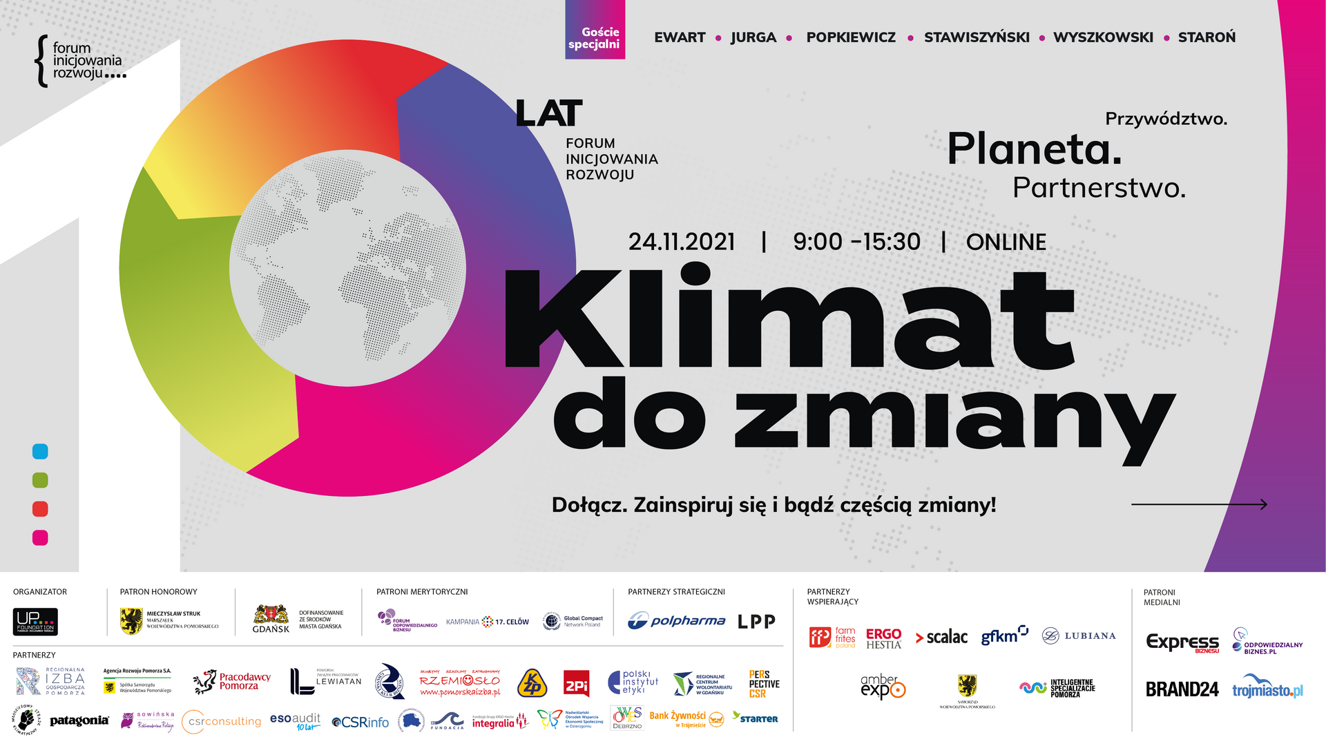 „Partnerzy Forum partycypują w organizacji wydarzenia zarówno finansowo, jak i merytorycznie. W tym roku do grona fundacyjnych partnerów dołączyła Ergo Hestia. Nasi wieloletni Partnerzy utożsamiają się z tematami, które podejmujemy podczas Forum i stąd wielopoziomowe zaangażowanie różnych firm i organizacji takich jak Polpharma, LPP, Farm Frites Poland, Scalac, Urząd Marszałkowski Województwa Pomorskiego, Miasto Gdańsk czy debiutująca w tym roku w roli partnera konferencji Gdańska Fundacja Kształcenia Menedżerów” – dodaje prezeska FIR UF. Miasto Gdańsk zaprezentuje dobre praktyki w zakresie budowania społeczności przyjaznej imigrantom. „Forum Inicjowania Rozwoju to jedyne miejsce, gdzie trzy, na co dzień odrębne światy, mogą dyskutować nad jedną, kluczową sprawą – zmianami społecznymi, związanymi także z różnorodnością, otwartą edukacją, integracją a także zmianami klimatycznymi ” – mówi Grzegorz Szczuka, dyrektor Wydziału Rozwoju Społecznego Miasta Gdańska. „Kryzys klimatyczny nie jest zjawiskiem odosobnionym. Jest spowodowany tym samym, co napędza inne kryzysy i nierówności na świecie. To mechanizm naczyń połączonych, stąd tak istotna jest nasza integracja w działaniu” – dodaje.