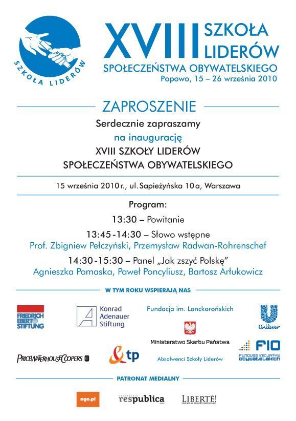 XVIII Szkoła Liderów odbędzie się w dniach 15 – 26 września 2010, w Popowie pod Warszawą. Inauguracją wydarzenia będzie słowo wstępne władz Szkoły prof. Zbigniewa Pełczyńskiego i Przemysława Radwana oraz dyskusja panelowa: „Jak zszyć Polskę” z udziałem Bartosza Arłukowicza (Sojusz Lewicy Demokratycznej), Pawła Poncyliusza (Prawo i Sprawiedliwość) oraz Agnieszki Pomaska (Platforma Obywatelska). Rozpoczęcie odbędzie się 15 września o godzinie 13.30 w sali konferencyjnej Fundacji Batorego (ul. Sapieżyńska 10a, Warszawa). Serdecznie Państwa zapraszamy.