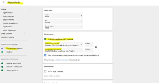 Aby aktywować tę opcję wystarczy wcisnąć przycisk Ustawienia oznaczony kołem zębatym w prawym, górnym rogu interfejsu. Następnie należy przejść do sekcji Ustawienia kalendarzy i wybrać z listy kalendarz, w którym chcemy pracować w innej strefie czasowej. Na górze otwartego menu znajdujemy przycisk Ustaw moją główną strefę czasową. Po jego kliknięciu zobaczymy dwa okienka – główna strefa czasowa i dodatkowa strefa czasowa. Jako główną najlepiej ustawić tę za granicą, zgodnie z którą będziemy ustalać nasz terminarz. Natomiast dodatkowa, czyli lokalna będzie wyświetlać nam się jako podpowiedź w podglądzie dziennym, 4-dobowym i tygodniowym.