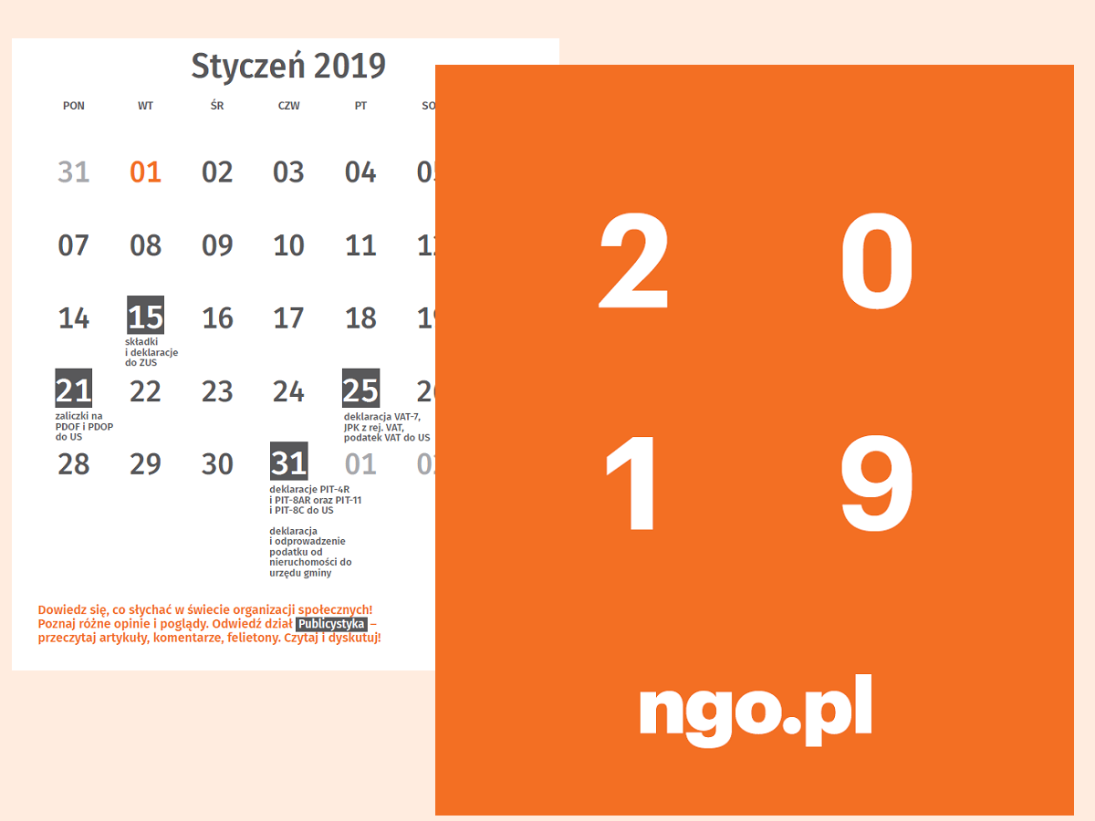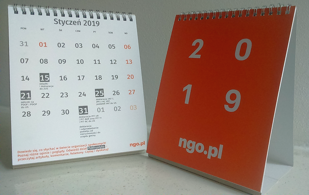 Poręczny kalendarz biurkowy NGO.PL. W środku ważne daty i przypomnienia o obowiązkach stowarzyszeń, fundacji.
