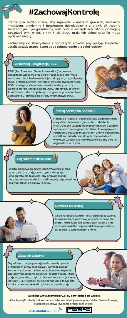 Branża gier wideo przypomina o najlepszych praktykach korzystania z wirtualnej rozrywki z okazji nadchodzących świąt. Celem inicjatywy #ZachowajKontrolę jest dostarczenie rodzicom i opiekunom graczy kluczowych informacji o graniu oraz przypomnienie najważniejszych zasad, które zapewniają pozytywne doświadczenia związane z grami wideo całej rodzinie.