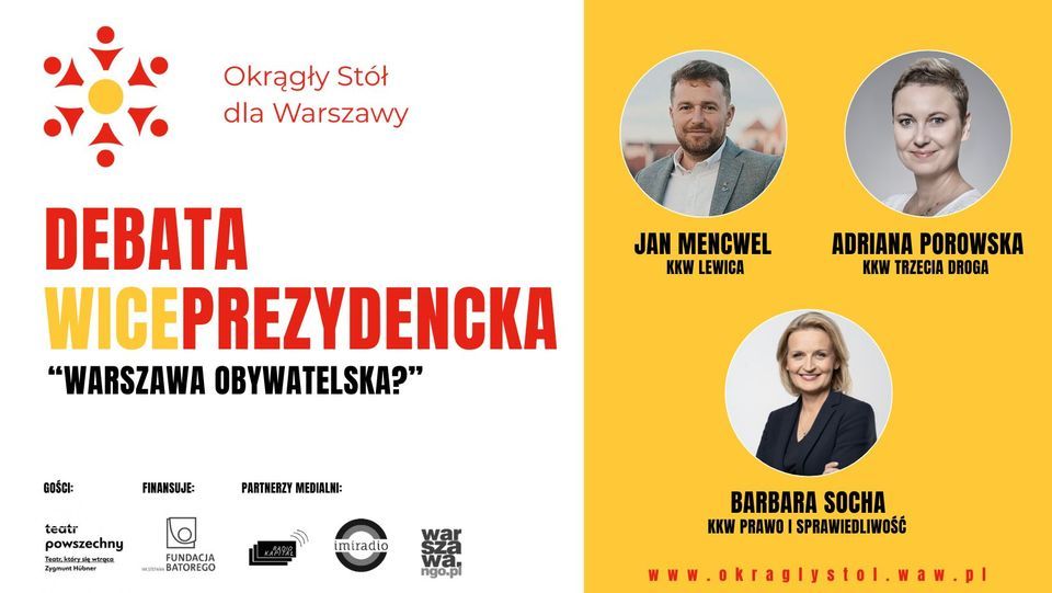 Debata będzie transmitowana online na profilu Okrągłego Stołu Dla Warszawy i w serwisie warszawa.ngo.pl