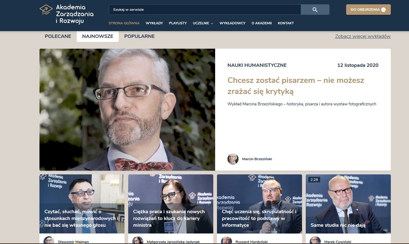 Na platformie edukacyjnej azir.edu.pl regularnie zamieszczane są nowe filmy z wypowiedziami ludzi sukcesu: znanych menedżerów, przedstawicieli nauki i sztuki. Opowiadają oni o swoich studiach, radzą, jaki kierunek wybrać i jak rozpocząć biznes, a także dzielą się refleksjami dotyczącymi swojej kariery. Nagrane specjalnie dla Akademii kilkuminutowe filmy można oglądać bezpłatnie.