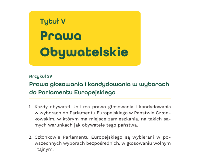 Warto sięgnąć po ten dokument także osobiście. Dowiedzieć się albo sobie potwierdzić, jakie prawa nam, obywatelkom i obywatelom UE przysługują. Jak choćby takie, że wraz z 26 innymi krajami Wspólnoty mamy prawo do wybrania naszych przedstawicielek i przedstawicieli do Parlamentu Europejskiego. I z tego prawa korzystamy co 5 lat - ostatnio 9 czerwca 2024r.