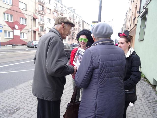 Mimo wyróżniających się kolorowych strojów i radosnych szerokich od ucha do ucha uśmiechów, nie było łatwo o uśmiechnięte twarze pasażerów komunikacji miejskiej. Na szczęście uczestnicy naszego klubu przewidzieli taką sytuację i dla najbardziej odpornych na uśmiech pasażerów zabrali cukierki oraz przygotowali zabawne obrazki, przedstawiające śmieszne miny. Wręczenie takich upominków okazało się kluczem do zobaczenia życzliwej miny na ich twarzach!