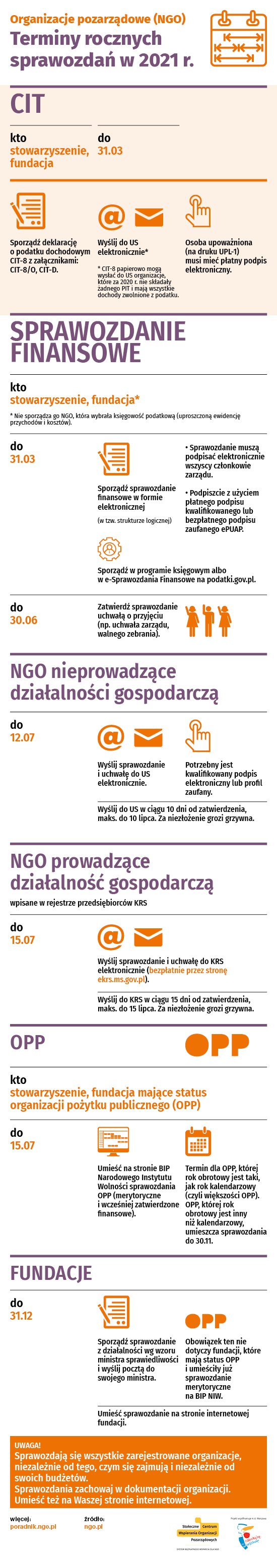 Organizacje pozarządowe co roku sporządzają sprawozdania finansowe i merytoryczne oraz składają je w różne miejsca. Obowiązków sprawozdawczych mają dużo – nietrudno się w nich pogubić. Dlatego na infografice zbieramy najważniejsze terminy związane ze sprawozdaniami i nie tylko. Podane terminy są terminami ustawowymi – standardowymi. Mogą jeszcze (wzorem roku ubiegłego) zmienić się z powodu epidemii.