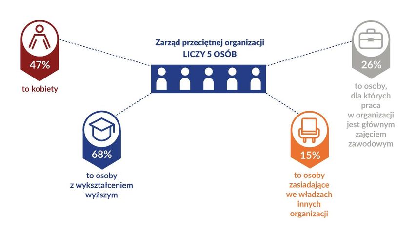 W zarządzie przeciętnej organizacji zasiada 5 osób. W takim przeciętnym NGO 47% członków zarządu to kobiety, 68% osób ma wykształcenie wyższe a dla 26% płatna praca w organizacji jest głównym zajęciem zawodowym. 15% członków zarządu przeciętnej organizacji zasiada także we władzach innych stowarzyszeń i fundacji.