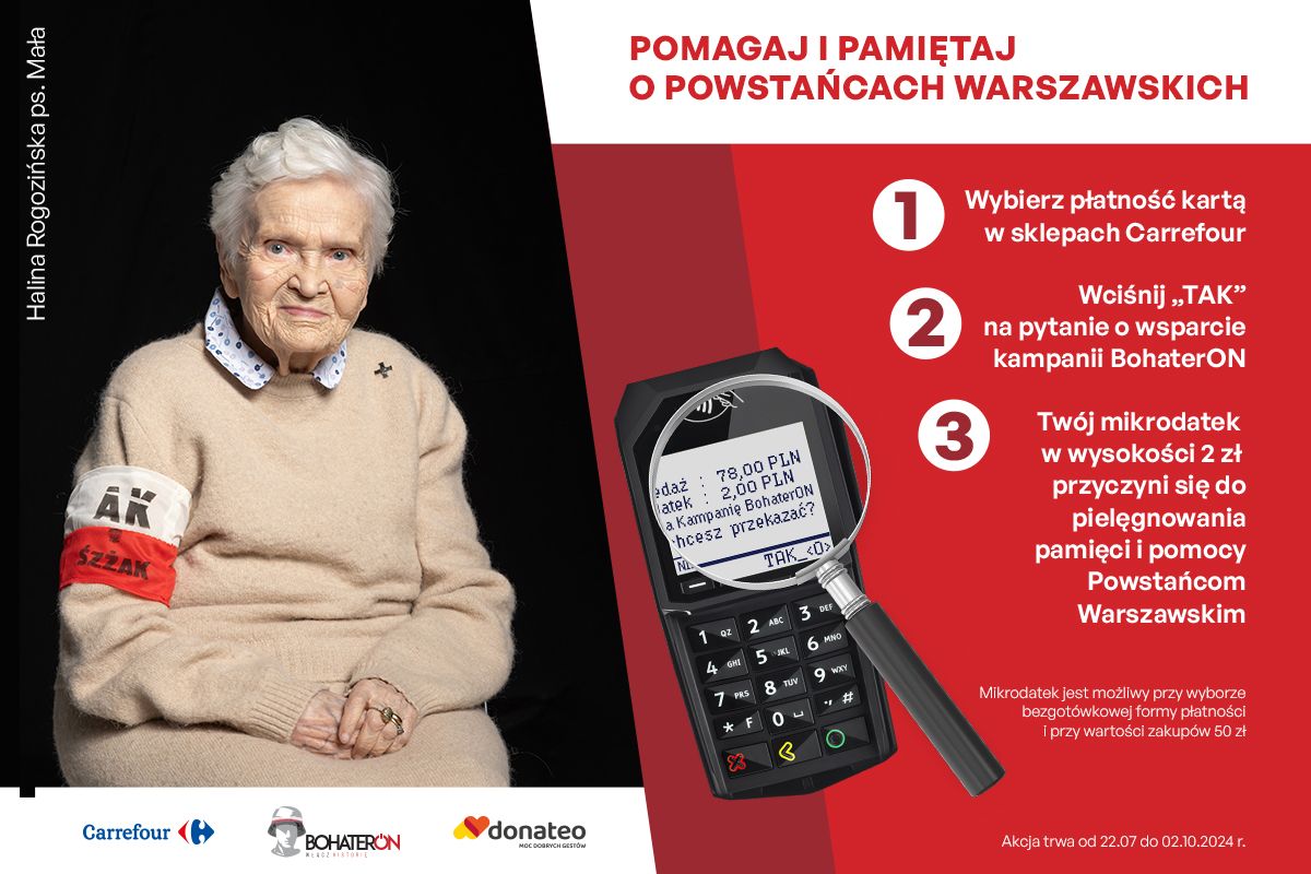 “Pomagaj i pamiętaj o Powstańcach Warszawskich” - pod takim hasłem 22 lipca br. w sklepach Carrefour ruszyła zbiórka na rzecz upamiętnienia Powstania Warszawskiego oraz wsparcia jego uczestników. Za pośrednictwem systemu mikrodonacji Donateo klienci sklepów Carrefour do 2 października br. mogą przekazać pieniądze na kampanię “BohaterON-włącz historię” Fundacji Sensoria.