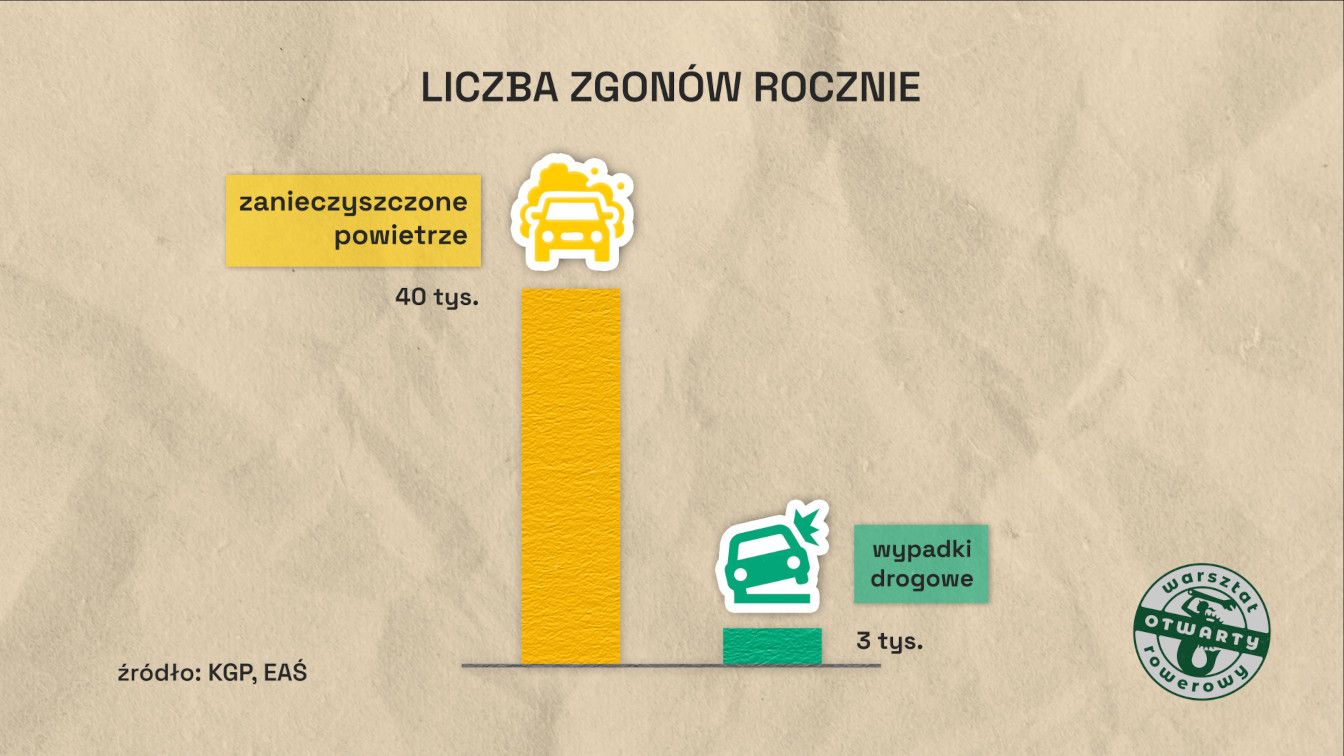Obrazek przedstawia wykres. Tytuł na górze: Liczba zgonów rocznie. Po lewej wyższa kolumna opisana "zanieczyszczone powietrze 40 tys." z obrazkiem samochodu wypuszczającego spaliny. Po prawej niższa kolumna podpisana "wypadki drogowe 3 tys." z obrazkiem samochodu wypadającego z drogi. Podpis: źródło: KGP, EAŚ