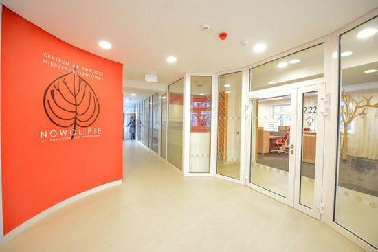 L.U.: – Każde z pięter ma inny kolor. Drugie piętro, przeznaczone dla NGO i pracowników Centrum, jest czerwone, w nawiązaniu do dobrej energii, która ma tutaj panować. Piętro pierwsze dedykowane dziennemu pobytowi, gdzie znajduje się m.in. fryzjer, sala warsztatowa, ma kolor żółty. Na parterze z klubokawiarnią dominuje kolor zielony. Za zaaranżowanie przestrzeni Centrum odpowiedzialna jest Pracownia Projektowa Artyści & Architekci. Motywem przewodnim wystroju wnętrz stał się liść lipy. Jest to jednocześnie logo Centrum Aktywności Międzypokoleniowe „Nowolipie”. W założeniu chcieliśmy nawiązać do nazwy ulicy, przy której znajduje się ośrodek, ale też do tradycji tego miejsca. Nawiązanie do lipy widoczne jest także na ścianach – niektóre wytapetowane są fraszką Jana Kochanowskiego „Na lipę”.