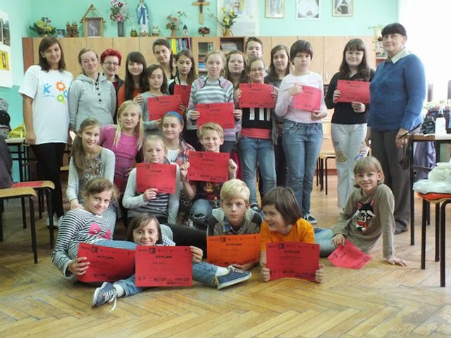 A w godzinach popołudniowych odbyły się zajęcia dla dzieci ze świetlicy bł. Edmunda Bojanowskiego prowadzonej przez Zgromadzenie Sióstr Służebniczek NMP NP . Tym razem trzynaścioro dzieci w wieku 7- 14 lat zostało wprowadzone w świat pierwszej pomocy. Pracując w grupach powtórzyliśmy numery alarmowe, nauczyliśmy się postępowania z osobą nieprzytomną oraz osobą bez czynności życiowych. Każdy wczuł się w rolę zarówno ratownika jak i poszkodowanego. Pojawiła się także "mała Ania". Podczas drugiej części zajęć ćwiczyliśmy postępowanie podczas zranień i urazów. Chwila nieuwagi i doszło do prawdziwego zdarzenia-krwawienie z nosa. Sytuacja została szybko opanowana, a dzieci przy okazji nauczyły się jak zachować się w takiej sytuacji.