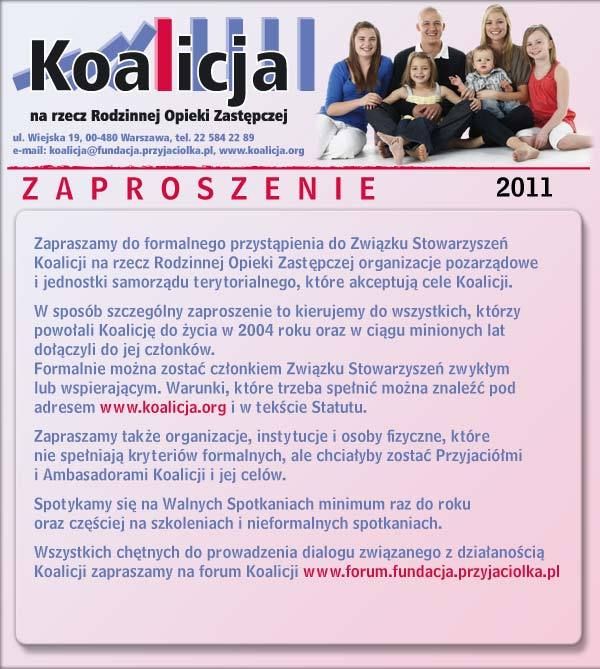 21 lutego 2011 r., jako związek stowarzyszeń, zarejestrowano Koalicję na rzecz Rodzinnej Opieki Zastępczej. Jej misją jest realizowanie prawa dziecka do wychowania w rodzinie. Dzieci, nie mogące wychowywać się w rodzinie biologicznej, dzięki opiece rodzin zastępczych i rodzinnych domów dziecka, będą miały większą szansę na rozwój, prawidłowy wzorzec rodziny i perspektywy szczęśliwego życia. Założyciele zapraszają do koalicji kolejne organizacje.