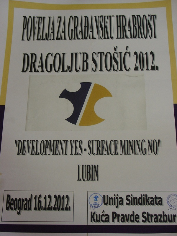 Predrag Savić, prezydent serbskiej organizacji pozarządowej „House of Justice – Strasbourg” (Kuća Pravde - Strazbur) z Belgradu, wybitny prawnik, obrońca mieszkańców wysiedlonych z odkrywki Kolubara przed Trybunałem w Strasburgu w laudacji na temat Koalicji „Rozwój TAK - Odkrywki NIE” (serb. „Razvoj DA - površinski ugljenokop NE") powiedział, że nagroda została przyznana za walkę o ludzkie, społeczne i środowiskowe prawa obywateli gmin wokół Lubina, którzy są zagrożeni, ponieważ polskie władze zamierzają wprowadzić w życie plany budowy odkrywkowej kopalni węgla brunatnego wraz z dwoma elektrowniami wbrew woli mieszkańców wyrażonej w referendum.