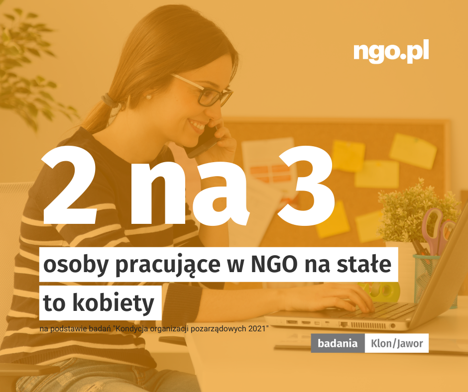 - 2 na 3 osoby pracujące na stałe w organizacjach pozarządowych to kobiety (chodzi o osoby pracujące na rzecz organizacji na stałe, co najmniej raz w tygodniu, bez względu na formę zatrudnienia).