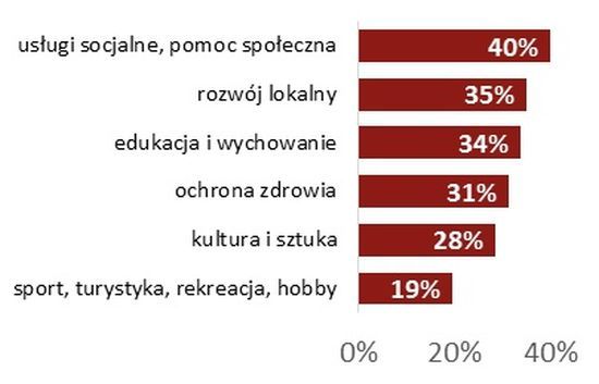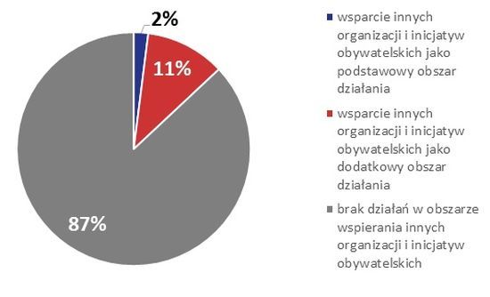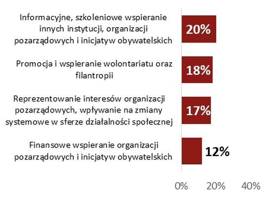 Czym dokładnie zajmuje się wspomniane 13% organizacji, które mają w orbicie swoich zainteresowań wspieranie innych fundacji, stowarzyszeń oraz inicjatyw obywatelskich? Co piąta organizacja „wspierająca” (20%) świadczy usługi o charakterze szkoleniowo-informacyjnym, nieco mniej (18%) promuje ideę wolontariatu oraz filantropii, 17% stara się reprezentować interesy wszystkich organizacji i wpływać na zmiany o charakterze systemowym służące działalności społecznej. Najmniej, bo jedna ósma (12%) organizacji „wspierających” oferuje wsparcie finansowe.