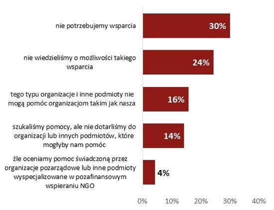 Zdecydowana większość fundacji i stowarzyszeń (70%) nie korzysta (przynajmniej świadomie) ze wsparcia udzielanego przez organizacje „infrastrukturalne”. Jakie są więc tego przyczyny? Zapytani o nie, liderzy stowarzyszeń i fundacji (niekorzystających ze wsparcia) odpowiadają najczęściej, że takiej pomocy po prostu nie potrzebują (30%). Pozostaje wierzyć, że ich organizacje po prostu radzą sobie świetnie bez pomocy z zewnątrz. Dość duża część (16%) odpowiada natomiast, że organizacje „wspierające” nie mogą pomóc „organizacjom, takim jak nasza”, co może już sugerować, że oferowane przez nie wsparcie nie jest adekwatne do potrzeb.