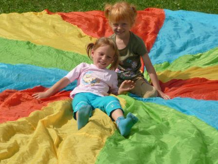 Gdy nasza grupa po wielu przygodach zawitała do stadniny, na twarzyczkach pojawił się cudowny uśmiech. Wszyscy byli głodni przygód, więc bez szemrania podzieliliśmy się na dwie grupy. W mig rozłożyliśmy chustę animacyjną, którą zawsze chętnie zabieramy w plener i która tym razem posłużyła nam za kocyk.