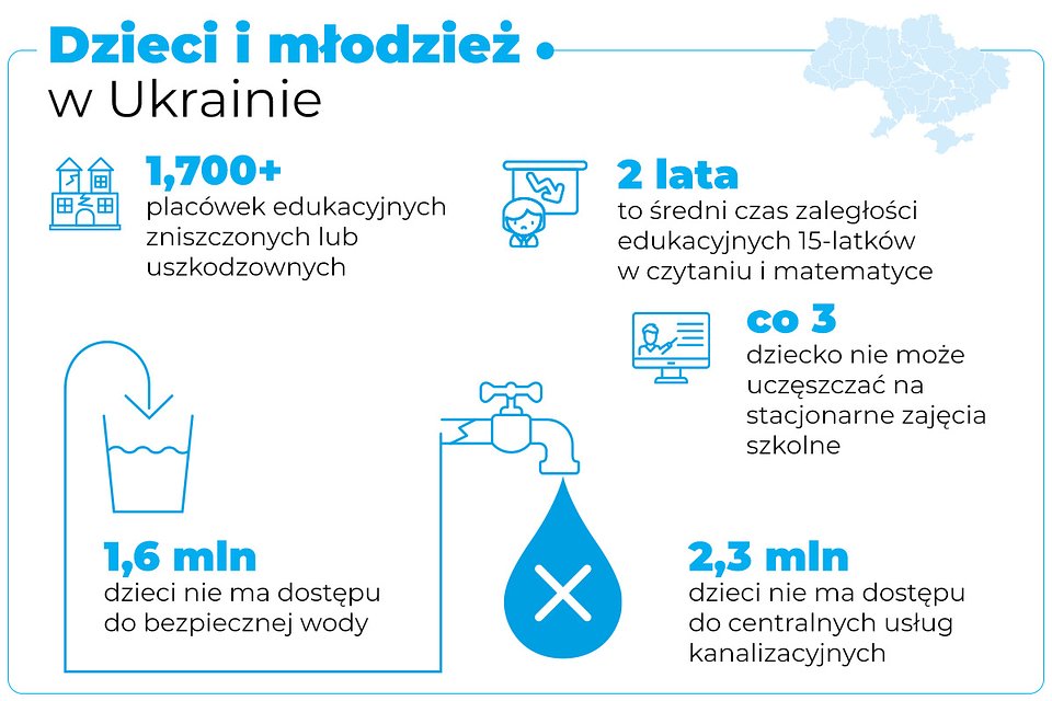 W wyniku ciągłych ataków dzieci nie mogą korzystać z usług, od których zależy ich rozwój. Ponad 1,7 tys. placówek edukacyjnych zostało uszkodzonych lub zniszczonych, a co czwarte dziecko nie może uczęszczać na zajęcia stacjonarne w pełnym wymiarze.