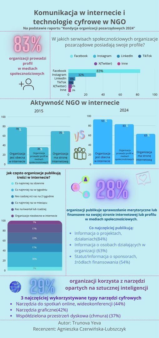 Infografika pokazuje, jak NGO komunikują w internecie w 2024 roku: jak często publikują treści, z jakich mediów społecznościowych korzystają oraz jakie narzędzia cyfrowe są najpopularniejsze. Zawiera także dane o tym, jakie informacje organizacje najczęściej udostępniają i jak niewielki odsetek z nich używa narzędzi opartych na sztucznej inteligencji.