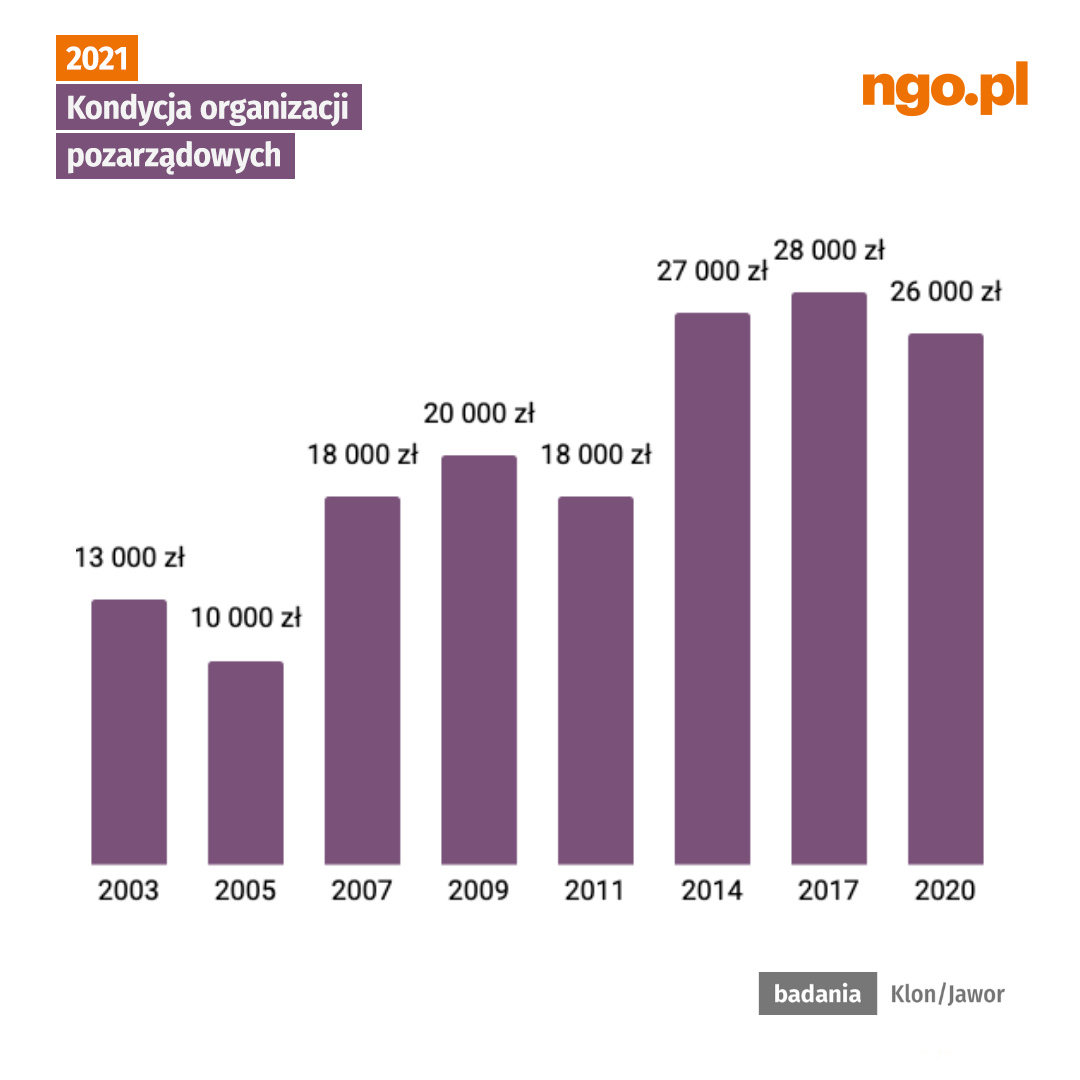 Jednocześnie, organizacjom, które posiadają na własność jakieś środki finansowe starczyłyby one na dłuższy okres prowadzenia podstawowych działań niż w 2017 roku - wtedy było to 6 miesięcy, w 2021 roku 10 miesięcy funkcjonowania organizacji.