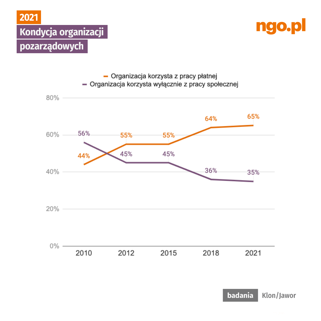 Organizacje pozarządowe są kojarzone ze społecznym, bezpłatnym zaangażowaniem działaczek i działaczy. Jednakże, poza pracą społeczną, korzystają też z pracy odpłatnej – i robią to coraz częściej. Tym samym zmniejsza się odsetek organizacji, które opierają się wyłącznie na pracy społecznej. W 2021 roku niemal dwie na trzy organizacje (65%) płaciły za wykonywaną dla nich pracę. Dekadę temu takich organizacji było tylko 44%.