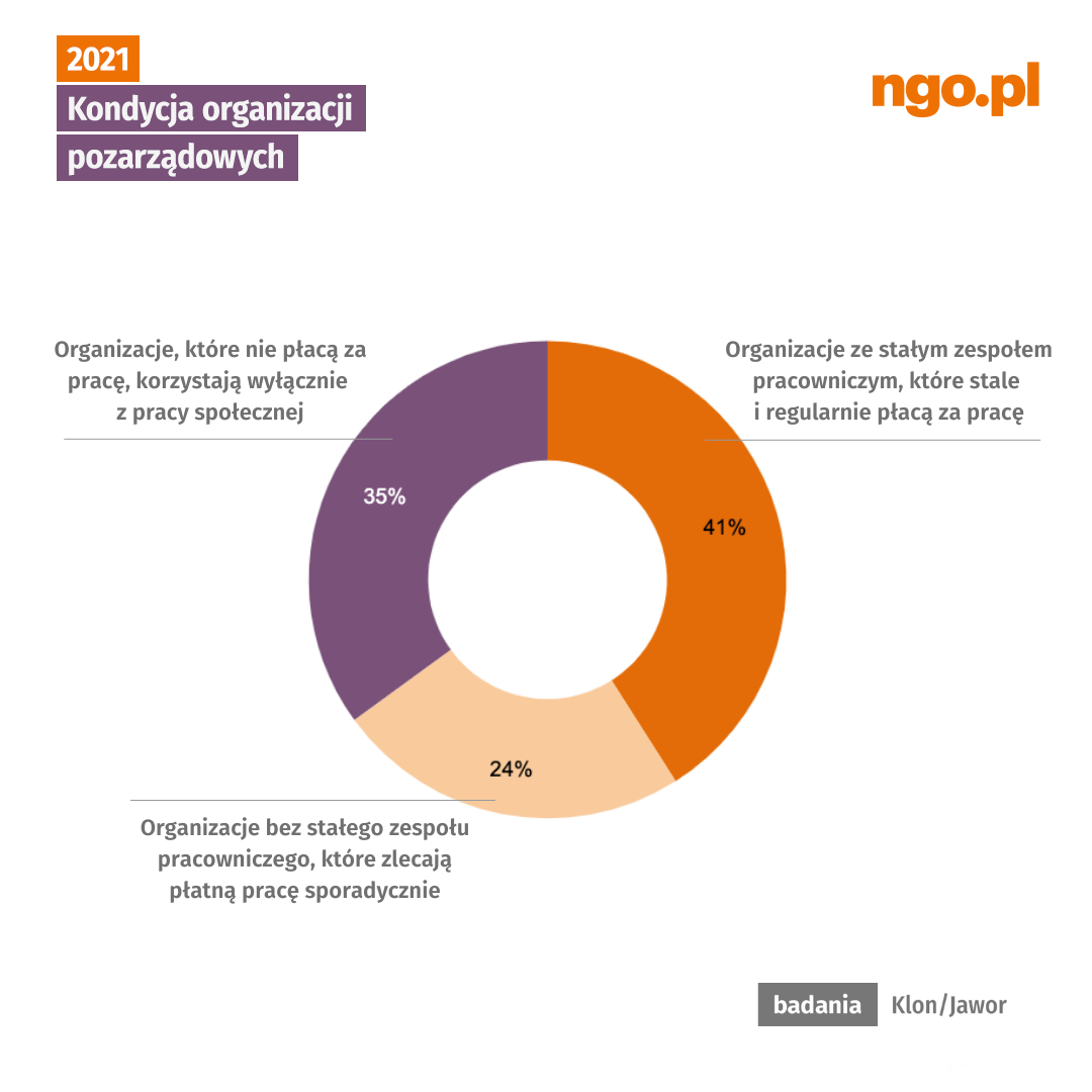 65% organizacji korzysta z pracy odpłatnej, choć w różnym zakresie i w różnej formie. Wśród nich możemy wyróżnić takie, które płacą za pracę stale i regularnie – takich organizacji jest 41%. Pozostałe 24% nie ma stałego płatnego personelu, ale korzysta z płatnej pracy i ma swoich współpracowników czy zleceniobiorczynie.