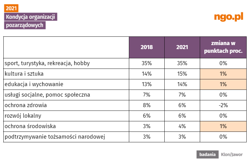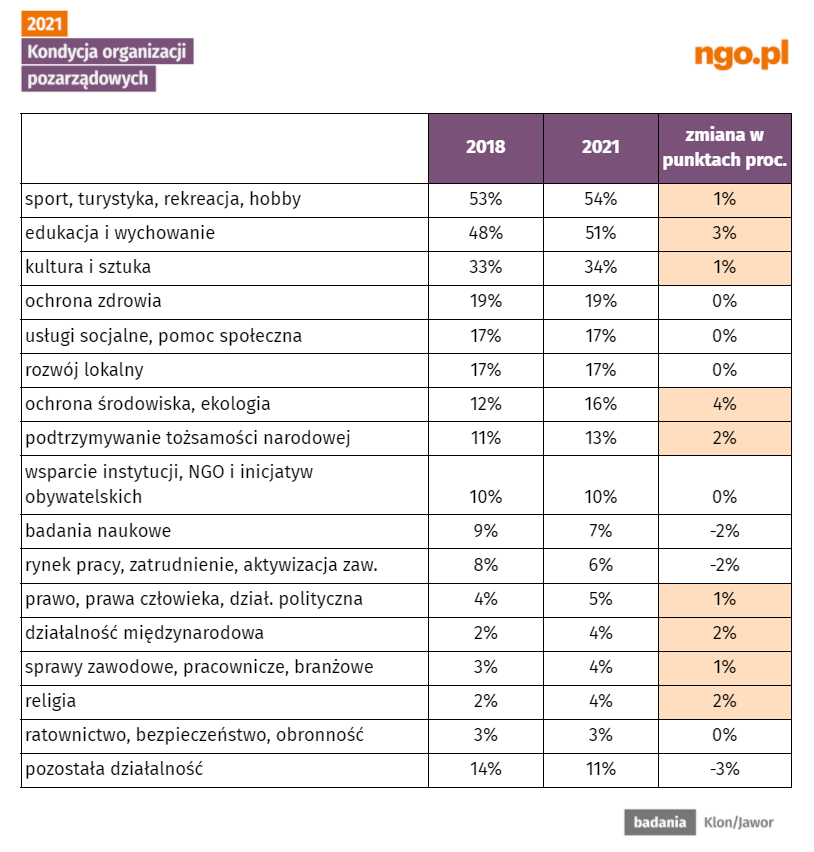 Warto zwrócić uwagę jeszcze na kilka zmian. Między 2018 a 2021 rokiem przybyło organizacji, które prowadzą działania w obszarze ekologii i środowiska, np. zajmują się edukacją dotyczącą zrównoważonego rozwoju, działaniami na rzecz zwiększania świadomości zagrożenia związanego z kryzysem klimatycznym.