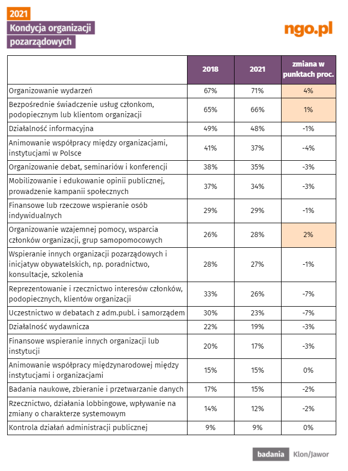 Organizacje częściej skupiają się zatem na bezpośrednim działaniu dla członkiń i członków czy odbiorczyń i odbiorców swoich działań. Wycofują się z kolei z działań o charakterze rzeczniczym, rzadziej wchodzą w dyskusję z samorządami czy administracją publiczną lub podejmują działania na rzecz systemowych zmian.