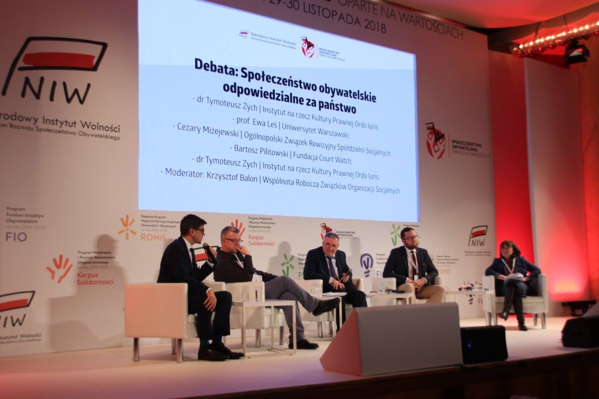 W pierwszej debacie plenarnej podczas konferencji podjęty został temat „Społeczeństwa obywatelskiego odpowiedzialnego za państwo”. Jej moderator, Krzysztof Balon, były przewodniczący Rady Działalności Pożytku Publicznego, rozpoczął od refleksji, czy tak słabe społeczeństwo obywatelskie, jak to przedstawił Gliński, jest w ogóle w stanie wziąć na siebie podobną odpowiedzialność. Sam Balon nie zgodził się z diagnozą wicepremiera, oceniając, że społeczeństwo obywatelskie w Polsce jest „relatywnie silne”. Następnie zapytał, czy klasyczne uprawianie polityki oraz klasycznie rozumiana klasa polityczna wystarczą jako fundamenty nowoczesnego organizmu państwowego w XXI wieku. Z pytaniem mierzyła się profesor Ewa Leś z Uniwersytetu Warszawskiego. Tłumaczyła, że nastawienie władz publicznych po 1989 roku zmierzało do osłabienia kontroli społecznej nad władzą – co niezamierzenie może być ciekawym komentarzem do tez stawianych przez ministra Glińskiego.