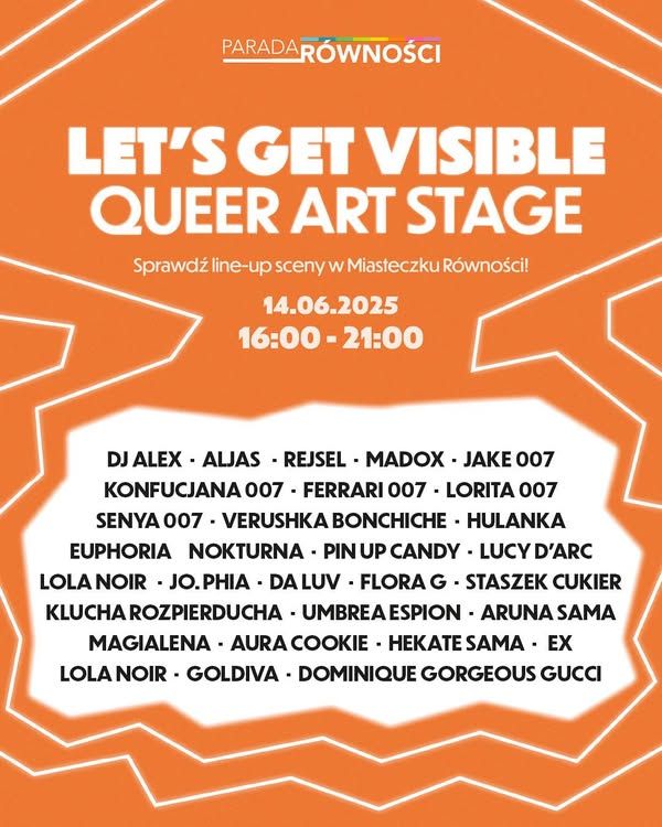 W tym roku Parada Równości przedłuża świętowanie - zaraz po przemarszu, od 16:00 do 21:00, na Queer Art Stage w Miasteczku Równości (Park Świętokrzyski) wystąpią osoby artystyczne różnych dziedzin. W programie m.in. DJ Alex, Madox czy Aljas.