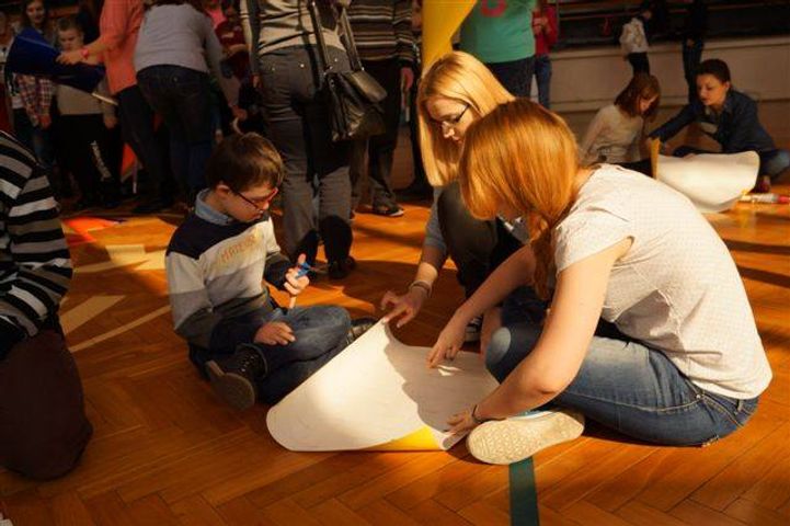 Zaczęło się od happeningu 20 marca, w trakcie zaćmienia słońca. Spotkaliśmy się w sali gimnastycznej przy ulicy Dworcowej, gdzie studenci z PWSZ wspólnie z osobami z zespołem Downa, tymi małymi i tymi dużymi, wycinali i naklejali na parasole kolorowe litery.