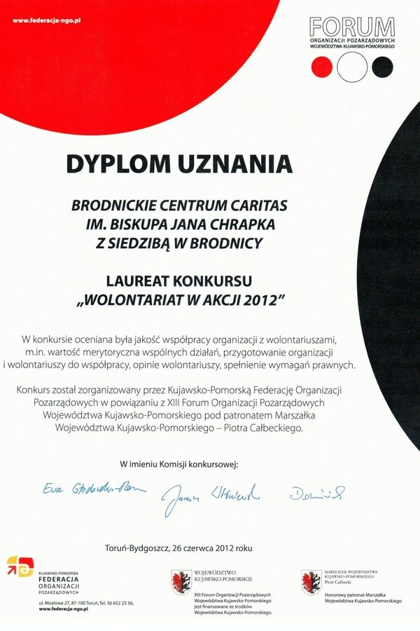 - Brodnickie Centrum Caritas im. Bpa Jana Chrapka, które zostało docenione przede wszystkim za wykorzystanie idei wolontariatu w ramach terapii i aktywizacji osób bezdomnych. Bezdomni angażując się jako wolontariusze pomagają nie tylko innym ale przede wszystkim sobie (www.caritasbrodnica.diecezja.torun.pl);