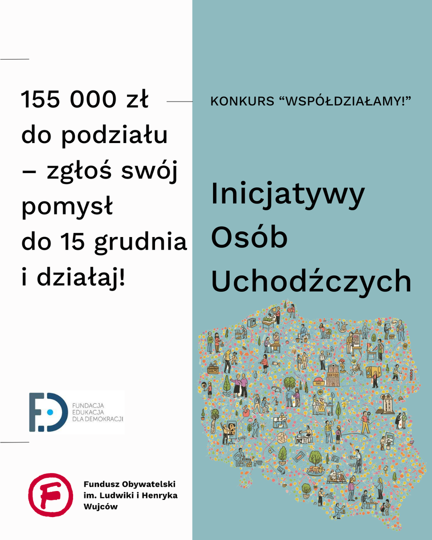 Падтрымка сацыяльных ініцыятыў асоб з вопытам уцекачоў у Польшчы. Сёлета на конкурс выдзелена 155 000 злотых. Плануецца падтрымаць 15–18 ініцыятыў або больш пры вялікай колькасці якасных заявак. Заяўкі прымаюцца да 15 снежня 2025 года, да 14:00 праз сістэму Witkac: www.funduszobywatelski.pl/wspoldzialamy. Падтрымка для арганізацый да 15 000 злотых, для нефармальных груп да 5 700 злотых. Тэматычных абмежаванняў няма, важныя ідэя і актыўнасць. Конкурс арганізуе Fundusz Obywatelski im. Ludwiki i Henryka Wujców. Партнёр конкурсу: Fundacja Edukacja dla Demokracji.