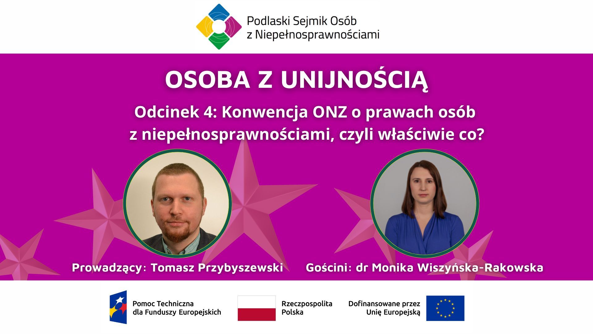 Grafika z napisami: OSOBA Z UNIJNOŚCIĄ. Odcinek 4: Konwencja ONZ o prawach osób z niepełnosprawnościami, czyli właściwie co? Prowadzący: Tomasz Przybyszewski, gościni: dr Monika Wiszyńska-Rakowska. Nad nazwiskami zdjęcia twarzy obu osób. Na górze logo Podlaskiego Sejmiku Osób z Niepełnosprawnościami. Na dole od lewej: logo Pomocy Technicznej dla Funduszy Europejskich oraz flagi Polski i UE, obok tej drugiej napis: dofinansowane przez Unię Europejską.