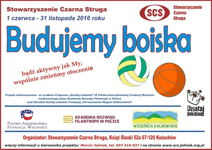 W imieniu Stowarzyszenia Czarna Struga w Książu Śląskim informuję, że stowarzyszenie nasze w okresie od 1 czerwca do 31 listopada 2016 roku, będzie realizowało projekt „Budujemy boiska”. Projekt jest dofinansowany ze środków Programu „Działaj Lokalnie IX” Polsko-Amerykańskiej Fundacji Wolności realizowanego przez Akademię Rozwoju Filantropii w Polsce oraz Ośrodek Działaj Lokalnie – Fundację „Porozumienie Wzgórz Dalkowskich”. W ramach projektu zostanie wybudowane boisko do minisiatkówki i do minikoszykówki w Książu Śląskim, a także zostaną zorganizowane turnieje sportowe.